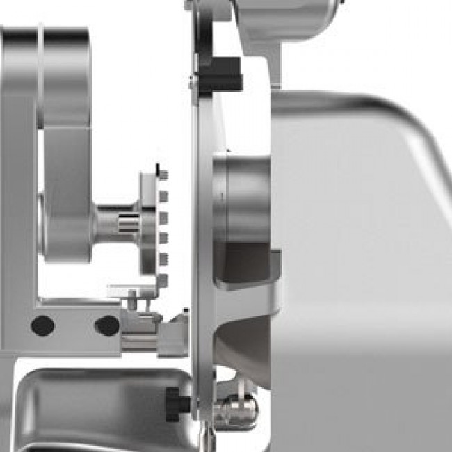 Linea arrotondata priva di spigoli e viti in vista. Affettatrice collocabile su un piano di lavoro da 70 cm con lama a costa bassa per minimizzare l’attrito con il prodotto e perno di scorrimento, cromato rettificato e lappato. Ottimo scorrimento del carro grazie alle boccole in ghisa lappate con carrello ammortizzato con paracolpi in gomma vulcanizzata.