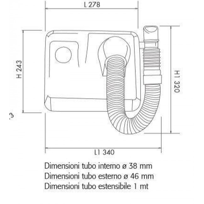 - Tubo estensibile antistrappo. Lunghezza tubo 1 metro. Diametro tubo 46 mm