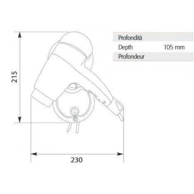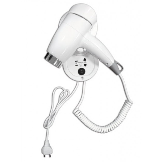 Asciugacapelli a pistola con base a muro per un' uso alberghiero. Dotato di un motore con resistenza da 1200 W e di una resistente scocca in ABS con profili cromati, questo asciugacapelli dispone di due regolazioni con cui scegliere calore e velocità dell’aria, un pulsante a rilascio di sicurezza, un interruttore on-off posto sulla base a muro ed una presa rasoio (220-110 V).