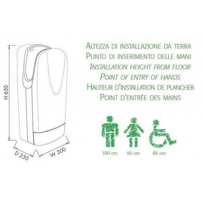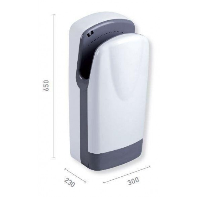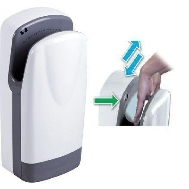 Prestazioni eccellenti e risparmio energetico sono le due caratteristiche che fanno di questo asciugamani l'ideale per le aree ad elevata utenza, grazie a due motori a spazzole, che lavorano simultaneamente raggiungendo una potenza complessiva di 1750 W, Massima è la convenienza in termini energetici, essendo privo di resistenza elettrica. Design semplice ed ergonomico, prevede un inserimento verticale delle mani, la cui presenza è rilevata da un sensore ad infrarossi che aziona due micro-correnti a lama.