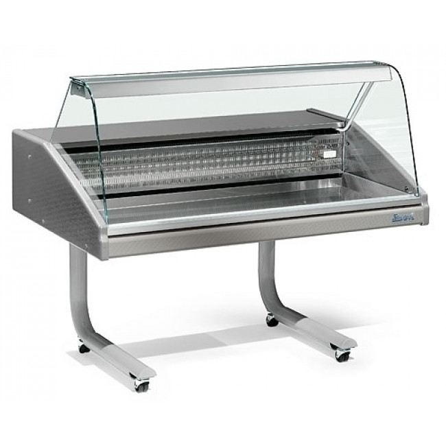 Vetrina refrigerata statica, adatta all’esposizione del pesce fresco con piano espositivo e piano lavoro in acciaio AISI 316 e gruppo incorporato situato sotto il piano lavoro. Dotata di scarico con rubinetto sotto il piano espositivo per lo smaltimento dell’acqua derivante dallo scioglimento del ghiaccio.