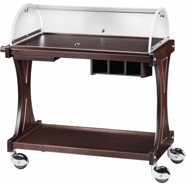 Carrello per dolci, formaggi e antipasti struttura in legno Wengè con cupola in plexiglas semicircolare con coperchi rientranti.