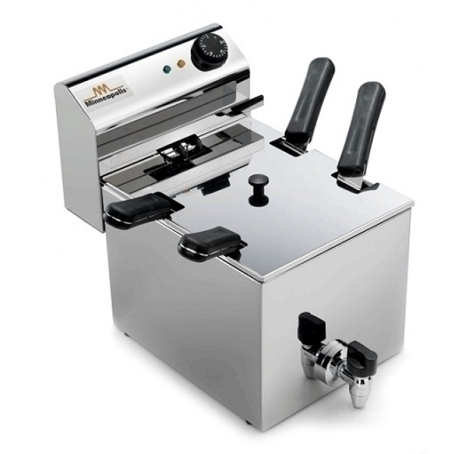 Resistenza corazzata speciale antiruggine e termostato di controllo con protezione termica di sicurezza. Cestelli microforati in acciaio inox con pratico manico