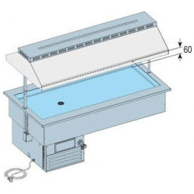 Vasca e involucro esterno in acciaio inox con evaporatore annegato. Drop-in e mobile da incasso refrigerato, profondità vasca mm 60 e carter di protezione gruppo refrigerante con griglie di ispezione in acciaio verniciato. Pannello elettico con pulsante di comando e termostato digitale
