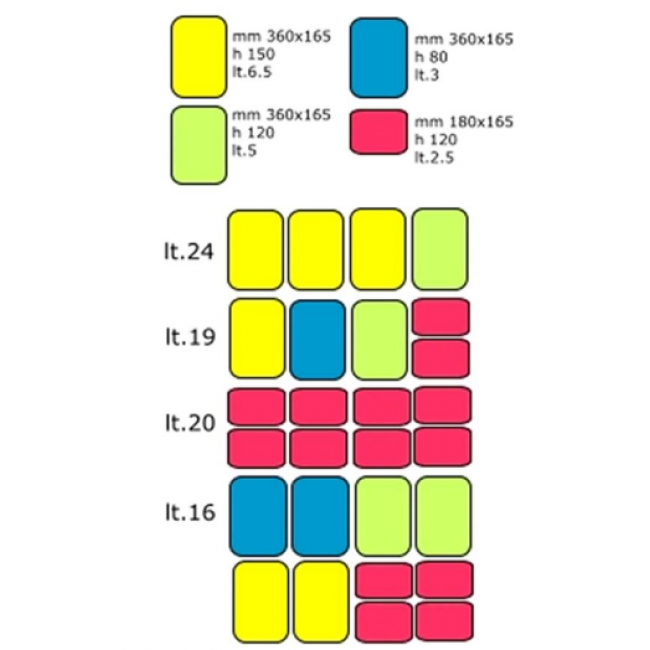 - Composizioni vaschette NON INCLUSE: Lt 24 (3 bacinelle da 6,5 lt + 1 bacinella da 5 lt); Lt 23 (2 bacinelle da 6,5 lt + 4 bacinelle da 2,5 lt); Lt 20 (8 bacinelle da 2,5 lt); Lt 19 (1 bacinella da 6,5 lt + 1 bacinella da 5 lt + 1 bacinella da 3 lt + 2 bacinelle da 2,5 lt); Lt 16 (2 bacinelle da 5 lt + 2 bacinelle da 3 lt)