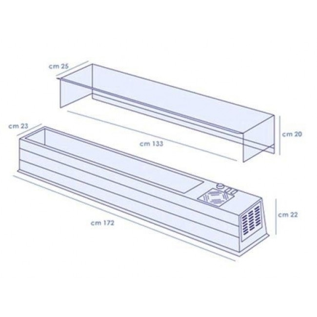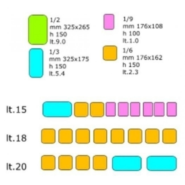 - Composizioni vaschette NON INCLUSE: 15 Lt (1 bacinella da 1/3 + 2 bacinelle da 1/6); Lt 18 (8 bacinelle da 1/6); Lt 20 (2 bacinelle da 1/3 + 4 bacinelle da 1/6)