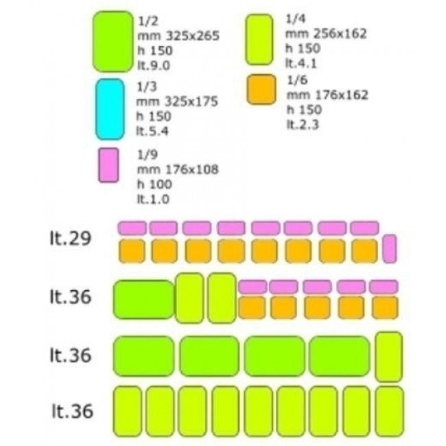 - Composizioni bacinelle NON INCLUSE: Lt 29 (8 bacinelle 1/6 h 15 + 9 bacinelle 1/9 h 10); Lt 36 (1 bacinella 1/2 h 15 + 2 bacinelle 1/4 h 15 + 5 bacinelle 1/6 h 15 + 5 bacinelle 1/9 h 10); Lt 37 (9 bacinelle 1/4 h 15); Lt 43 (4 bacinelle 1/2 h 15 + 1 bacinella 1/4 h 15)