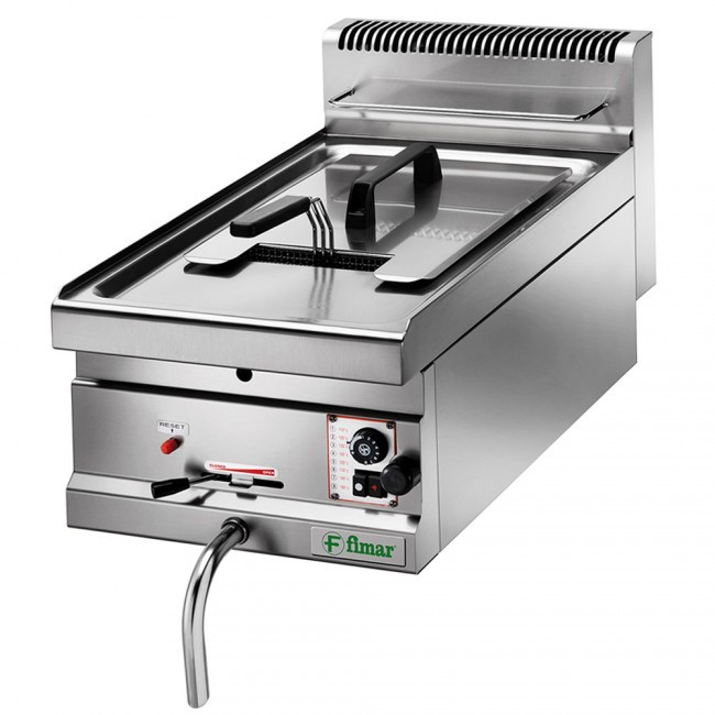 Coperchio, cestello, struttura e resistenza in acciaio inox con piano di lavoro e vasche stampate in acciaio inox spessore 15/10 e manici cestelli e pomelli coperchi in materiale isolante. Bruciatori inox tubolare con sistema turbolatore che rallenta il flusso della fiamma aumentandone la resa di circa il 50%, combustione ottimizzata con valvola termocoppia e termostato di sicurezza