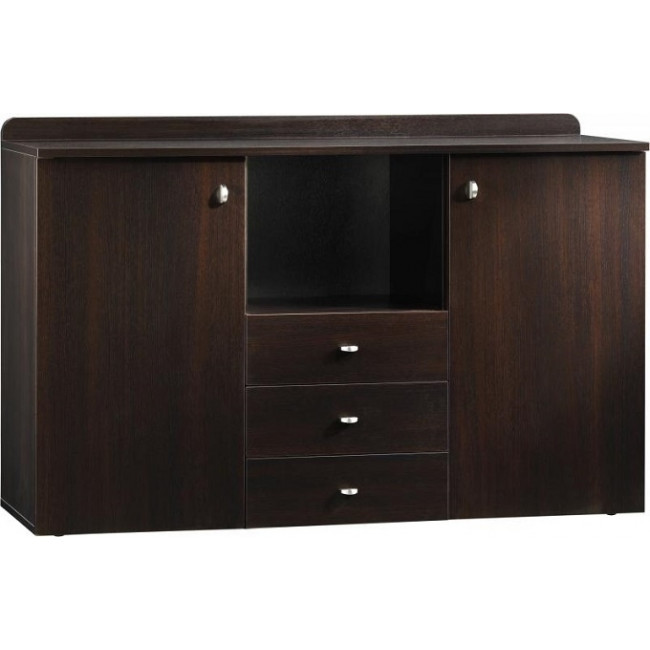 Struttura impiallicciata di Wengè, tre cassetti, due sportelli, un vano a giorno.