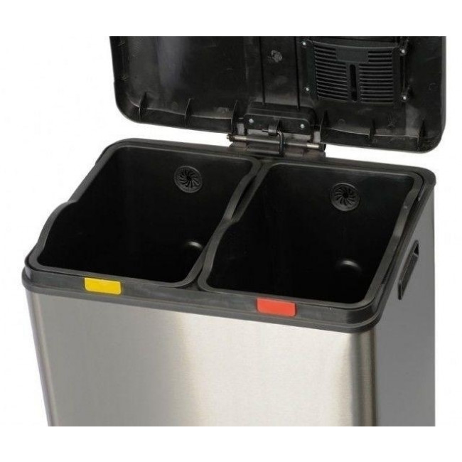 Struttura in acciaio inox AISI 430 satinato anti-traccia con coperchio in polipropilene e acciaio inox e sistema di chiusura del coperchio rallentato e silenzioso. Maniglie laterali per un facile spostamento e secchi interni in polipropilene