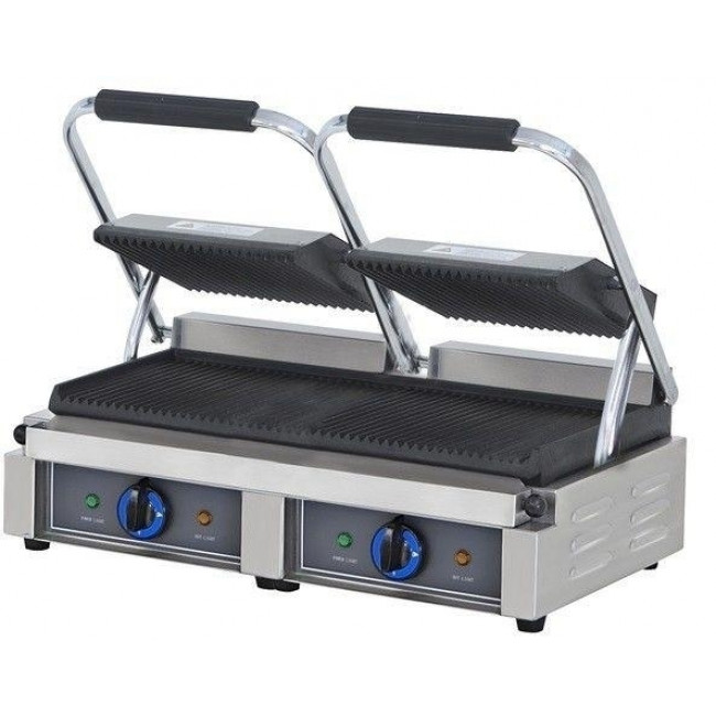Struttura in acciaio inox con doppia piastra con funzionamento indipendente e bacinella di scarico residui di cottura in acciaio INOX amovibile. Manopole di comando in materiale atermico e segnale luminoso di presenza tensione.