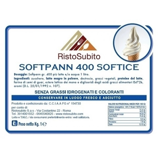 Preparato già aromatizzato in polvere per Gelato Soft/Softpanna/400 senza grassi idrogenati Buste da gr 1000 in cartoni da 15 buste Modello 40