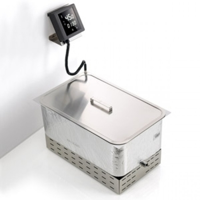 Apparecchio da incasso per la cottura a bassa temperatura con riscaldamento statico dell’acqua. Struttura, vasca e coperchio in acciaio inox e potenti resistenze corazzate a contatto nel fondo della vasca.