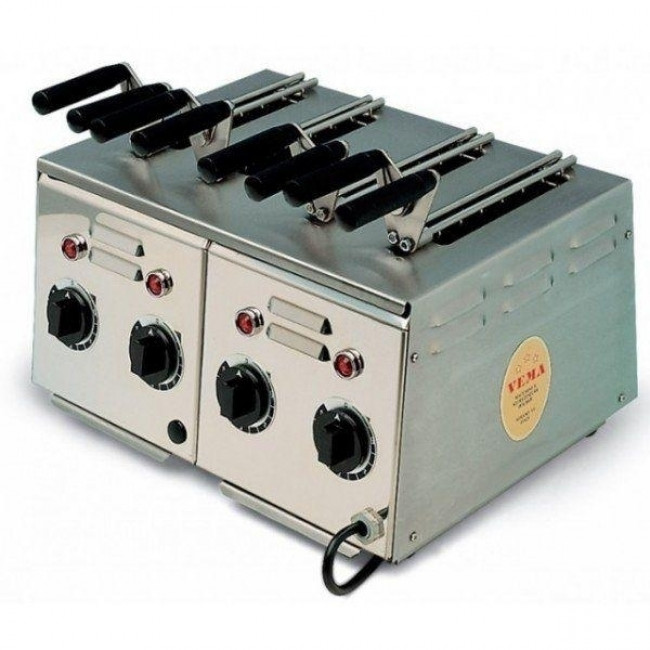 Tostapane in acciaio inox a 4 forni con accensione indipendente dotato di 4 pinze. Apparecchi adatti alla cottura veloce di toast farciti, piadine o fette di pane per la colazione. I cibi, trattenuti dalle pinze vanno inseriti nei forni verticali e, nel giro di pochi minuti, vengono perfettamente tostati e cotti a puntino.
