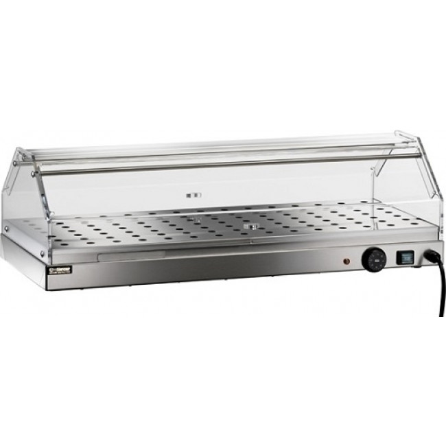 Costruite in acciaio inox con fianchi e antine sui due fronti in plexiglas trasparente e ripiano di base e intermedio estraibili. Riscaldamento a mezzo resistenza con regolazione della temperatura a mezzo termostato 30/90 °C, interruttore luminoso e lampada spia di funzionamento.