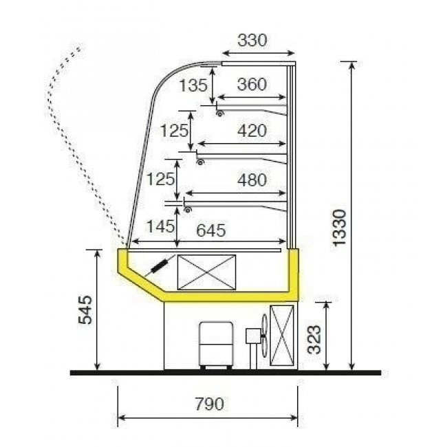 Vetrina Refrigerata ideale per pasticceria secca, sandwich Zoin Modello Harmony ES212B Vetro temperato curvo apribile verso il basso Refrigerazione Ventilata gruppo incorporato